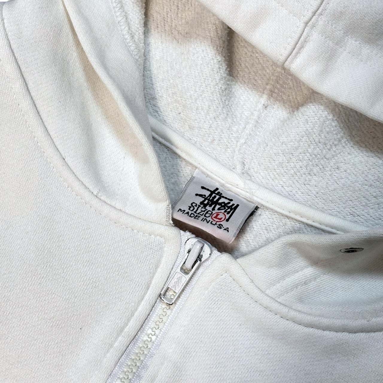 このデザインはプリントのTシャツでさえあまり出てこないですがこちらは刺繍で、しかもジップパーカー。カラーが白なのも最高なところです。