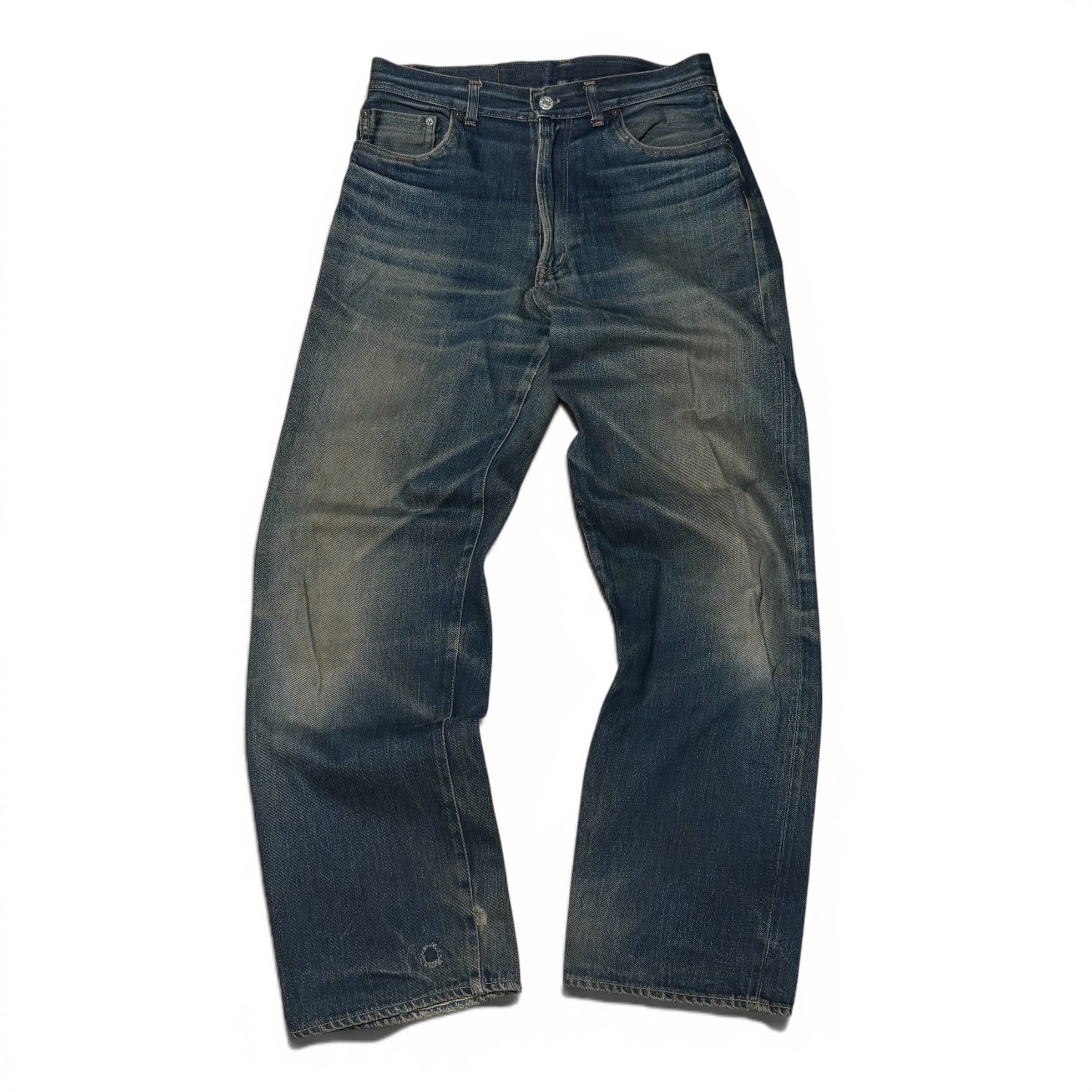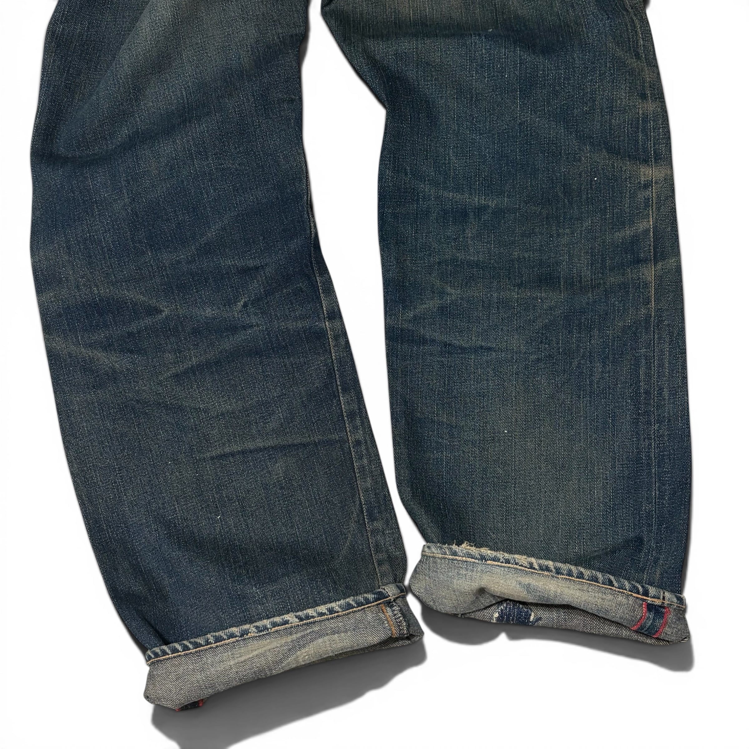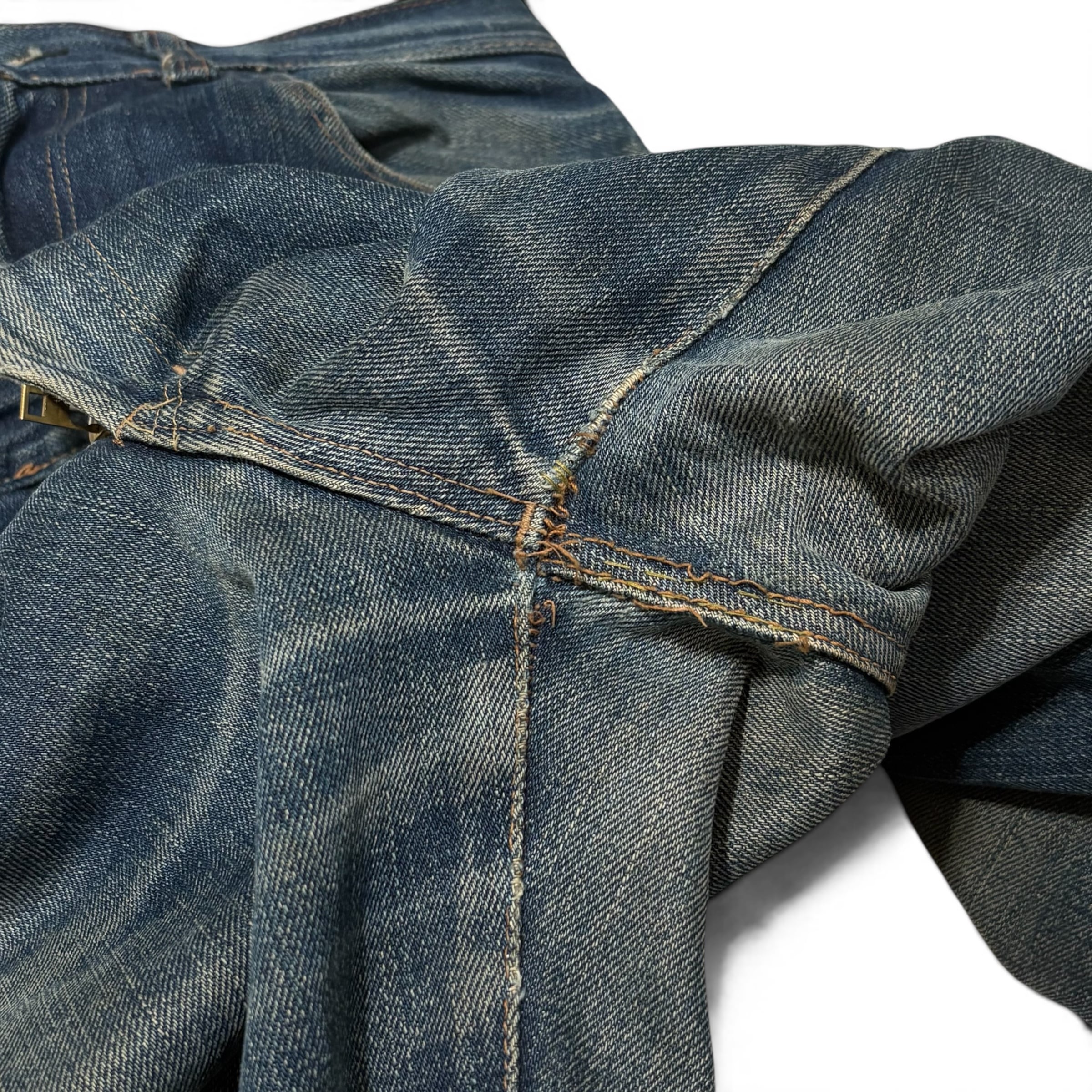 こちらのアイテムのクオリティも高く、ヴィンテージデニムに遜色ない色落ち、アタリ、やや太めのシルエット。